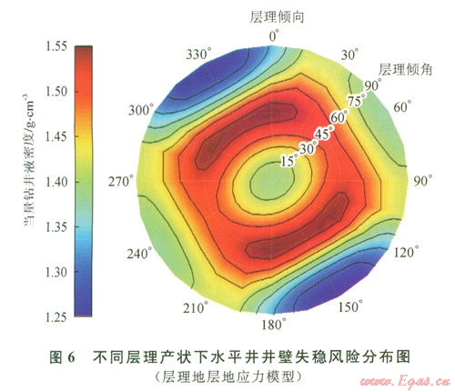層理面產(chǎn)狀設(shè)置如下:傾角取0°、l5°、30°、45°、60°、75°、90°7種情況,傾向從正北方位N0°E,以l5°為單位順時(shí)針遞增到N360°E。根據(jù)以上模型與參數(shù),計(jì)算沿最小地應(yīng)力方向所鉆水平井在不同層理產(chǎn)狀下的坍塌壓力變化規(guī)律。