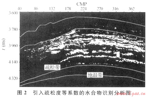 采用疊前AVO反演求得縱橫波速度信息[7]。通常海洋中淺層地層的地震縱波速度為1.6~1.8km/s,在含天然氣水合物層中,地震波速度將提高至1.85~2.5km/s,在速度剖面上,水合物層的層速度變化趨勢呈典型的三段式,即上下低,中間高。同時結(jié)合疏松系數(shù)、地?zé)崽荻鹊葏?shù),可以提高水合物識別的可信度(圖2)。