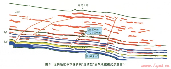 在構(gòu)造較平緩的斜坡帶地區(qū)如龍崗9井或龍崗7井等廣大的區(qū)域,中、下侏羅統(tǒng)的主要烴源巖為涼上段的黑色泥頁巖以及大安寨段的黑色泥頁巖、石灰?guī)r,這些烴源巖生成的烴類,首先由附近的小斷裂或(和)裂縫(構(gòu)造縫、層間縫)的疏導(dǎo),向就近的涼高山組或大安寨段中的具有一定儲集條件的砂巖中或富有溶蝕孔隙、裂縫的介殼灰?guī)r中運移、聚集。從而形成一些自生自儲型的孤立的巖性或裂縫性油氣藏。