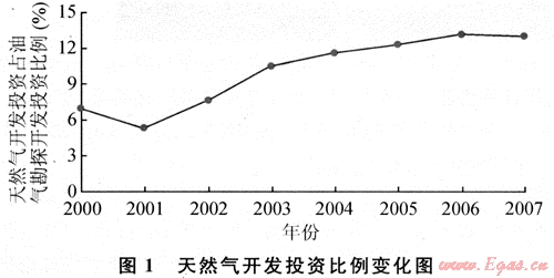 近幾年來,天然氣工業(yè)呈跨越式發(fā)展態(tài)勢,伴隨著天然氣儲量、產量的迅速增長,天然氣開發(fā)建設投資規(guī)模不斷擴大。從中石油來看,在投資方向上不斷向天然氣業(yè)務傾斜,天然氣開發(fā)投資比重不斷增加(見圖1),由2000年占公司勘探開發(fā)總投資的7%,上升到2007年的13%。