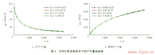 圖4給出了不同級(jí)別擴(kuò)散系數(shù)條件下頁(yè)巖氣水平井的日產(chǎn)氣量和累積產(chǎn)氣量曲線,由圖4可知:氣體擴(kuò)散系數(shù)由