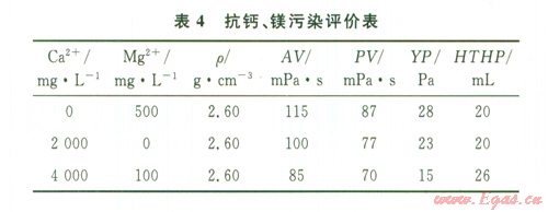 對可應(yīng)用于鹽膏層鉆井液來說,較強(qiáng)的抗鈣、鎂離子污染性能是其必須具備的基本性能。進(jìn)行了抗鈣、鎂污染評價,試驗結(jié)果見表4。