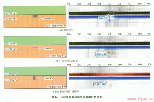 通過(guò)不同類型裂縫網(wǎng)絡(luò)模型正演(圖14):網(wǎng)狀裂縫具有典型的雜亂反射特征,而近水平裂縫表現(xiàn)為穩(wěn)定強(qiáng)反射特征,高角度垂直縫沒(méi)有明顯地震響應(yīng)。因此,利用“雜亂反射”屬性進(jìn)行須三段裂縫預(yù)測(cè)。