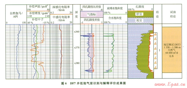 圖5、6分別為DF3井與DF7井低阻氣層識(shí)別與解釋評(píng)價(jià)成果圖。其中前3道為常規(guī)原始曲線,氣層段的電阻率極低,約1.7 Ω·m,與上下泥巖層電阻率極為接近,是典型的低阻氣層。該氣層只用電阻率曲線是無(wú)法判斷的,直接由密度、中子、聲波測(cè)井曲線判斷也比較困難。第5道為含氣指示,利用四孔隙度比值(藍(lán)色線)與差值(粉紅色線)曲線重疊的方法直觀反映氣層與水層。第6道為利用文中所述的方法計(jì)算得到的含水飽和度與束縛水飽和度曲線。