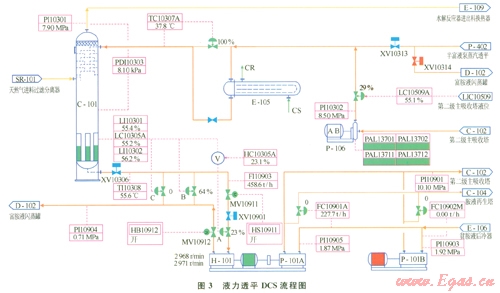 液力透平位于脫硫單元一級主吸收塔C-101的下游,富胺液自一級吸收塔底出來后進人液力透平膨脹做功,所產生的動能用以驅動貧胺液泵,做功后的低壓富胺液送至閃蒸罐。液力透平的DCS流程如圖3所示。