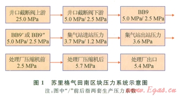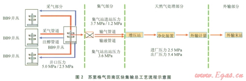 區(qū)塊集輸總工藝為(2)井下節(jié)流,在BB9'或BB9〞井叢集中注醇;中壓集氣;所有BB9'或BB9〞井叢單獨(dú)敷設(shè)集氣管道,放射狀接至臨近集氣站的多井集氣管網(wǎng);④集氣站、天然氣處理廠兩次增壓、氣液分輸;⑤集中處理。
