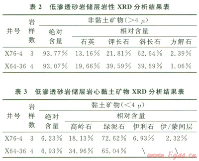 首先對實驗巖心樣品進行XRD分析,其結果見表2、3??梢钥闯觯簬r石骨架部分以長石為主,石英含量次之;黏土礦物含量較少,以綠泥石為主,綠泥石含量在50.0%~75.30%之間。