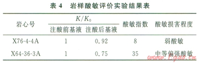 依據(jù)《儲層敏感性流動實驗評價方法》(SY/T 53582002)中酸敏評價實驗方法對巖心樣進行了鹽酸敏感性評價實驗。實驗導致巖心滲透率發(fā)生不同程度地降低,結果呈現(xiàn)出一定的酸敏損害程度,表現(xiàn)為弱—中酸敏,其結果見表4。