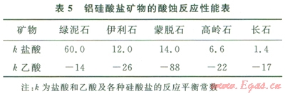 有學者研究了鹽酸與各種鋁硅酸鹽礦物的反應動力學,并將反應速度常數(shù)的對數(shù)值為50時對應的溫度(T50)作為各種鋁硅酸鹽在鹽酸中保持穩(wěn)定的溫度上限,各種鋁硅酸鹽的T50值如表5所示。表5同時也給出了根據(jù)熱力學數(shù)據(jù)計算出來的鹽酸與醋酸與各種鋁硅酸鹽礦物反應的平衡常數(shù)??梢钥闯?,在熱力學上,這些鋁硅酸鹽均可以溶于鹽酸,但幾乎完全不溶于醋酸;而在動力學上,沸石在鹽酸中最不穩(wěn)定,綠泥石次之,長石最穩(wěn)定。在儲層中占優(yōu)勢的鋁硅酸鹽礦物的T50低于儲層溫度時,應該考慮在酸化液中用乙酸代替鹽酸[6-8]