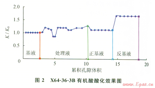 可考慮采用乙酸并適當加大注酸量。乙酸為弱酸,既可均勻溶蝕礦物表面、擴大疏通孔喉,又可避免黏土殘片脫落造成微粒堵塞喉道。