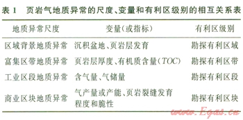 地質異常找礦理論和方法是基于對“致礦地質異常”的深入研究,對包括非傳統(tǒng)礦產(chǎn)資源在內的各類礦產(chǎn)資源進行預測的有效理論和方法[l8],其在非傳統(tǒng)金屬礦床的勘探中已經(jīng)取得了很大成功[19-22]。對于頁巖氣這種非傳統(tǒng)油氣資源,地質異常找礦理論與方法也具有廣闊的應用前景。筆者基于頁巖氣地質異常理論框架研究成果,根據(jù)頁巖氣的特殊地質條件,將頁巖氣藏的地質異常序列區(qū)分為區(qū)域背景地質異常、富集區(qū)帶地質異常、潛在工業(yè)區(qū)段地質異常和商業(yè)區(qū)塊地質異常4個層次:①區(qū)域背景地質異常主要指標包括沉積盆地和頁巖發(fā)育;②頁巖氣富集區(qū)帶地質異常主要指標包括頁巖厚度和總有機碳含量(TOC);③頁巖氣潛在工業(yè)區(qū)段地質異常的主要指標包括氣含量和氣儲量;④頁巖氣商業(yè)區(qū)塊地質異常的主要指標包括頁巖氣產(chǎn)量、產(chǎn)能、頁巖的裂縫發(fā)育程度和脆性。這4個層次的異常分別是頁巖氣勘探有利區(qū)域、頁巖氣勘探有利區(qū)帶、頁巖氣勘探有利區(qū)段和頁巖氣有利區(qū)塊等4個不同有利級別預測區(qū)圈定的依據(jù)。頁巖氣地質異常的尺度、變量、有利區(qū)級別的相互關系可概括為表l。