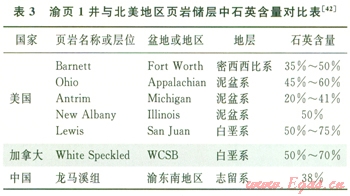 渝東南地區(qū)下志留統(tǒng)龍馬溪組頁巖中的石英含量與美國已開發(fā)頁巖儲層中的石英含量相當(表3),渝東南地區(qū)龍馬溪組頁巖中石英的平均含量為38%,表明該區(qū)頁巖氣儲層多具有良好的可壓裂性。