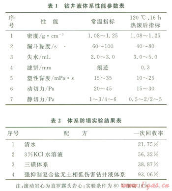 考慮體系總固相含量控制的要求和強(qiáng)抑制性的需要,重點(diǎn)研究了可溶性有機(jī)鹽、無(wú)機(jī)鹽在提高液相密度和鉆井液抑制性的作用,體系防塌實(shí)驗(yàn)結(jié)果見(jiàn)表2。有機(jī)鹽溶液自身具有較高的密度,僅其水溶液密度就可超過(guò)1.25 9cm3,復(fù)配使用無(wú)機(jī)鹽就可以提高體系的抑制性,以滿足防塌的要求。另外輔以G302-SZD等即可形成具有較好封堵作用的濾餅,進(jìn)一步提高體系的防塌效果。