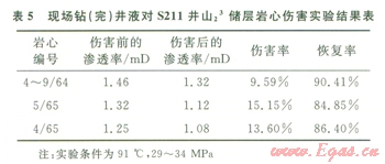 從表5中可以看出,現(xiàn)場(chǎng)鉆井液完井液對(duì)山23儲(chǔ)層傷害較低,且傷害后恢復(fù)率可達(dá)84.85%以上,這表明恢復(fù)性良好,具有很好的暫堵保護(hù)作用,兩口井試產(chǎn)都獲高產(chǎn)。