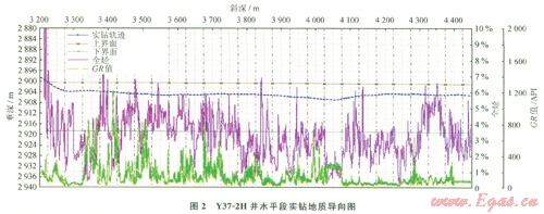 Y37-2H井應用的哈里伯頓公司FEWD隨鉆地質導向儀器能夠隨鉆實時測量傳輸2條伽馬曲線和特淺、淺、中、深4條電阻率曲線,為現(xiàn)場地質導向提供隨鉆地質參數(shù)[4]。