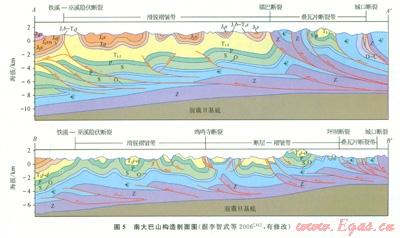 摘 要 位于四川盆地邊緣的大巴山山前帶由于構造變形較為強烈,地表地震地質情況復雜,給地震資料采集和處理帶來諸多困難,目前該區(qū)勘探程度還較低。為預測其油氣勘探前景,從生儲蓋組合、烴源巖條件、儲層條件、蓋層條件等幾個方面分析了該區(qū)油氣成藏條件,發(fā)現其原始成藏條件優(yōu)越,存在3套成藏組合和多種類型的勘探目的層。古油藏解剖結果表明,山前帶二、三疊系油氣主力烴源巖為上二疊統(tǒng),油氣成藏分為3個階段:①晚三疊世—早侏羅世開始變形,形成寬緩背斜,形成古油藏;②中侏羅世—早白堊世進一步變形,圈閉構造定型,部分古油藏裂解,形成油氣藏;③古近紀喜山運動對先期構造進行了強烈的改造,造成古油氣藏的調整與破壞。綜合評價該區(qū)構造變形樣式、儲層分布和油氣顯示特征后認為:南大巴山西北部鎮(zhèn)巴斷裂至鐵溪—巫溪隱伏斷裂是油氣勘探有利區(qū),應以二疊系長興組和三疊系飛仙關組礁灘相儲層勘探為主展開工作;東南部雞鳴寺斷裂至鐵溪—巫溪斷裂為二、三疊系出露區(qū),應以落實寒武系膏鹽巖下伏地層的保存條件為主進行勘探部署。