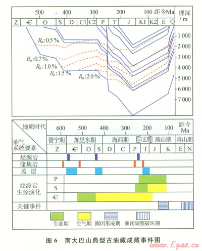 結合南大巴山的構造發(fā)育史,該區(qū)油氣藏成藏過程可以分為3個階段:晚三疊世—早侏羅世開始變形,形成寬緩背斜,形成古油藏;中侏羅世—早白堊世進一步變形,圈閉構造定型,部分古油藏裂解,形成油氣藏;古近紀喜山運動對先期構造進行了強烈的改造,造成古油氣藏的調整與破壞。