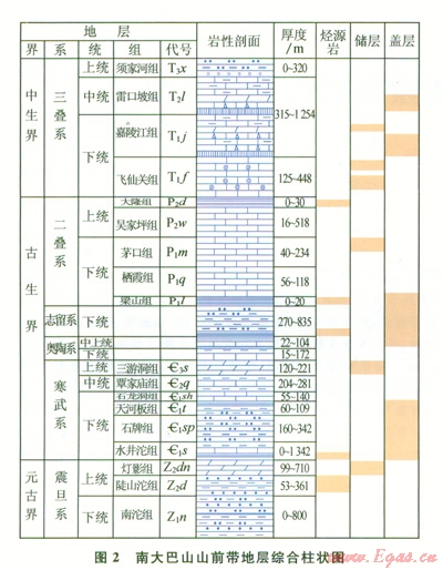 該區(qū)主要經歷了2個大的沉積—構造演化階段:震旦紀—中三疊世為海相臺地—臺緣沉積—構造演化階段;晚三疊世—始新世為陸相碎屑沉積盆地沉積—構造演化階段??傮w上缺失上志留統(tǒng)一石炭系,其他層位較為齊全。發(fā)育4套構造—地層沉積組合:①基底組合(Pt);②臺地(臺緣)組合(Z—S);③臺地—裂陷邊緣組合(P—T2);④前陸盆地組合(T3x—J)。