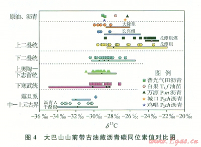 高演化烴源巖的生物標志化合物在油源對比工作中存在很多不確定性,而不同時代烴源巖干酪根和抽提物同位素組成之間有明顯的差異,是油源和氣源對比的一種現實方法。南方海相古生界烴源巖中干酪根碳同位素值變化非常有規(guī)律,從中上元古界到上古生界,干酪根的碳同位素值由輕變重。該區(qū)古油藏瀝青和油苗的碳同位素值分布,均與上二疊統(tǒng)泥巖氯仿瀝青“A”的碳同位素值接近(圖4),表明它們之間具有親緣性。
