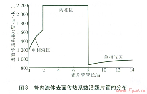 管外壁溫度在單相液區(qū)急劇升高,到達(dá)兩相區(qū)后有一個突降,而后保持不變,到達(dá)缺液區(qū)后逐漸升高,在單相氣區(qū)也是緩慢升高。由管外壁溫度沿翅片管的分布可以看出,在單相液區(qū)和兩相區(qū)的核態(tài)沸騰區(qū),即從人口至管長大約6m處,管外壁溫度較低,容易發(fā)生結(jié)露或結(jié)霜現(xiàn)象。