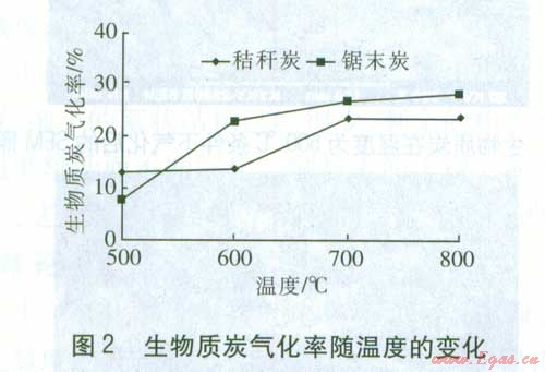 對兩種生物質(zhì)炭在不同溫度(分別為500、600、700、800℃)下的氣化特性進(jìn)行研究。生物質(zhì)炭氣化率隨溫度的變化見圖2。