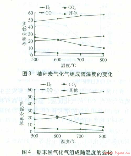 由圖3、4可知,兩種生物質(zhì)炭氣化氣組成的變化趨勢基本相同,只是具體值存在差異。溫度較低時(shí),炭的氣化活性較差,氣體組成變化緩慢;隨著溫度的升高,炭的氣化反應(yīng)加速,氣化氣組成發(fā)生了較大變化。溫度較低時(shí),兩種生物質(zhì)炭氣化氣內(nèi)的H2體積分?jǐn)?shù)較大,都超過了40%,c0和c02體積分?jǐn)?shù)相近且較小;隨著溫度的升高,H2體積分?jǐn)?shù)增大,最高時(shí)達(dá)58.0%。C02體積分?jǐn)?shù)顯著減小,C0體積分?jǐn)?shù)較快增大。當(dāng)溫度升高到800℃時(shí),c0與c02的體積分?jǐn)?shù)比為2~3。鋸末炭氣化氣內(nèi)的其他氣體組分含量較多,分析認(rèn)為可能是鋸末炭內(nèi)殘留的揮發(fā)分受熱揮發(fā)造成的。