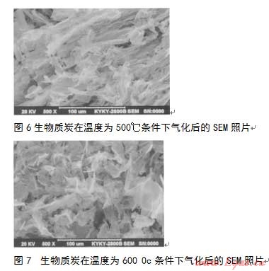 生物質(zhì)炭在蒸汽作用下發(fā)生氣化,其微觀結(jié)構(gòu)也會(huì)發(fā)生變化。使用掃描電子顯微鏡(SEM)對不同溫度下,生物質(zhì)炭經(jīng)過蒸汽氣化后的微觀結(jié)構(gòu)進(jìn)行研究。生物質(zhì)炭在溫度分別為500、600、700和800℃條件下氣化后的SEM照片分別見圖6~9。