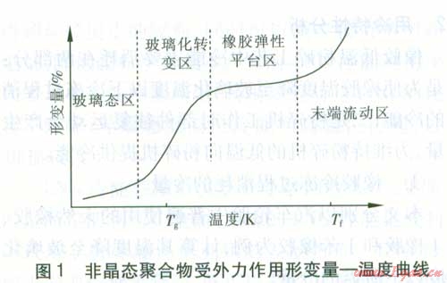 通常所說的橡膠是指玻璃化溫度(Tg)低于室溫的非晶態(tài)聚合物。橡膠和塑料就是按照玻璃化溫度是在室溫以上還是在室溫以下進行區(qū)分的。玻璃化溫度在室溫以下的聚合物稱為橡膠,玻璃化溫度在室溫以上的聚合物稱為塑料。玻璃化溫度是聚合物的特征溫度之一,非晶態(tài)聚合物在玻璃化溫度附近發(fā)生玻璃態(tài)一橡膠態(tài)轉(zhuǎn)變。圖l為非晶態(tài)聚合物受外力作用產(chǎn)生的形變量一溫度變化曲線。對于同一種聚合物,當其溫度大于Tg時,聚合物處于橡膠態(tài);當溫度小于Tg時,聚合物處于玻璃態(tài)。處于橡膠態(tài)的聚合物當有外力作用時發(fā)生大的形變,外力撤去后形變可以恢復(fù),也就是我們通常所說的橡膠彈性。在一定溫度范圍內(nèi)(橡膠彈性平臺區(qū)),當溫度降低時,處于橡膠態(tài)的聚合物在外力作用下的形變量隨溫度變化很小。隨著溫度的下降,在玻璃化溫度附近,當溫度發(fā)生很小變化時,聚合物受外力產(chǎn)生的形變量隨溫度變化出現(xiàn)明顯變化,表現(xiàn)為隨溫度的降低形變量顯著減小。當溫度繼續(xù)降低,聚合物進入玻璃態(tài),此時聚合物已完成了橡膠態(tài)一玻璃態(tài)之間的轉(zhuǎn)變,在外力作用下聚合物的形變量受溫度變化影響很小,形變量也很小。廢舊橡膠低溫粉碎就是通過冷凍使橡膠溫度降至玻璃化溫度以下,使其進入玻璃態(tài),低溫下橡膠分子鏈段不能運動,表現(xiàn)出膪|生,從而易于粉碎。