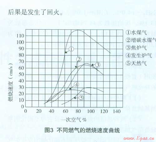 圖3所示為不同燃氣的著火速度與一次空氣百分數(shù)的關(guān)系曲線,如與單一氣體的曲線相比可看出其火焰?zhèn)鞑ニ俣鹊淖畲笾迪喈斀咏?,但并不發(fā)生在相同的一次空氣百分數(shù)值時。假設(shè)一個使用天然氣的燃燒器按一次空氣系數(shù)為65%調(diào)定(由圖3可知,曲線所示的著火速度約為9cm/s),然后改燒熱值為l400Btu/cf(52.16MJ/m3)的丁烷一空氣混合氣,則一次空氣百分數(shù)很快上升到80%,火焰?zhèn)鞑ニ俣冗_到29cm/s[5],后果是發(fā)生了回火。