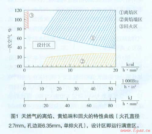 同樣,如用同一種燃氣在一個已定的燃燒器上對不同火孔負荷和已知燃燒器頭部溫度條件下進行運行試驗,就可得到該燃氣完整的離焰和黃焰端的極限特性曲線。同時也指明了發(fā)生離焰和黃焰端時相應(yīng)一次空氣百分數(shù)的最大值和最小值。