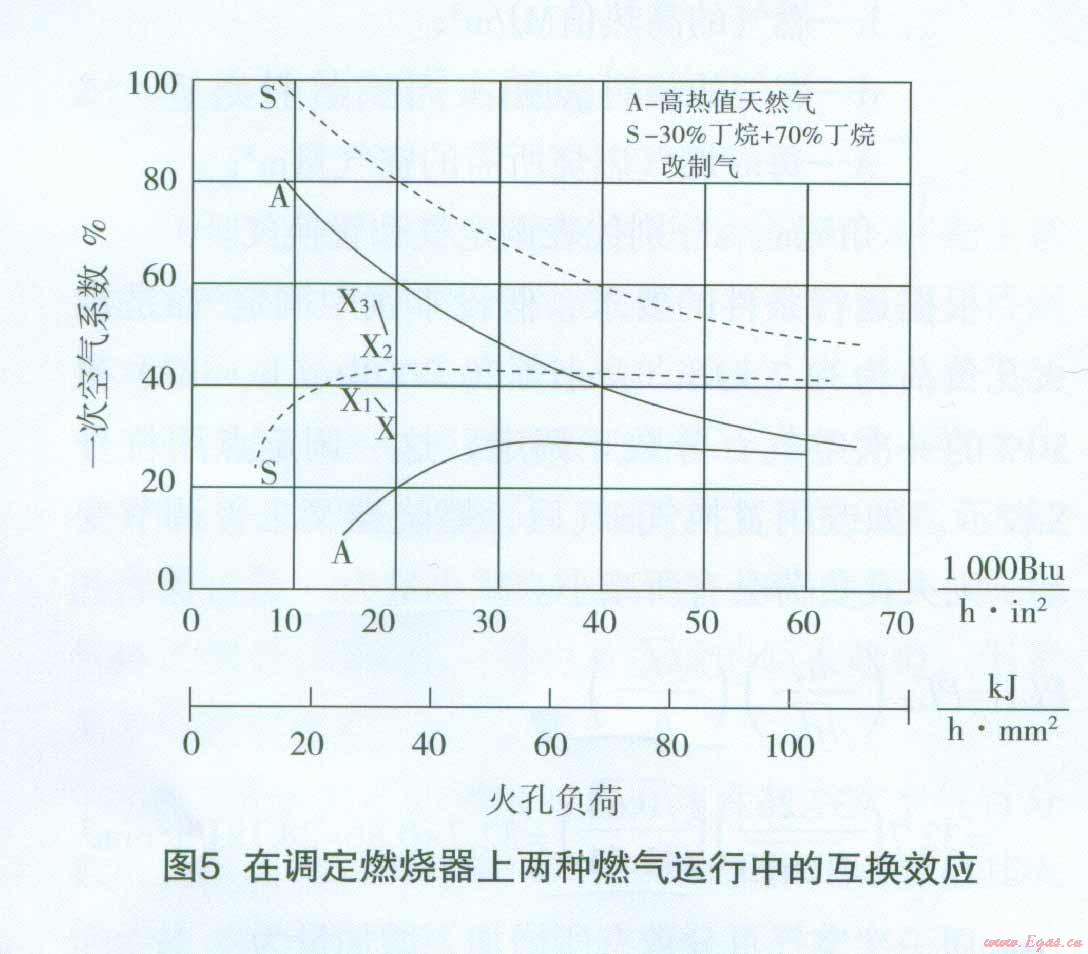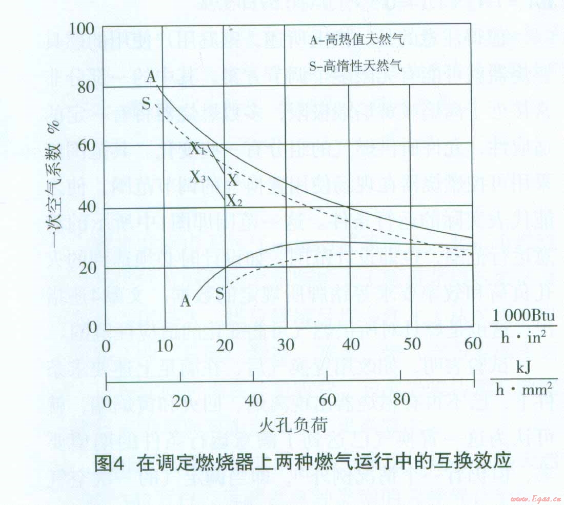 這說明用高熱值天然氣調(diào)定后的燃燒器在改用高惰性天然氣置換后,其運行工作點x。已高于高惰性天然氣的離焰極限曲線值(見圖4中X1的位置),會發(fā)生離焰。顯然,如調(diào)定點x置于調(diào)定氣的極限曲線上(一次空氣系數(shù)接近60%一見圖4),則置換后的工作點X1將遠高于置換氣的離焰曲線(圖上未表示),這一運行工況是完全不能接受的。在這一特殊的假設(shè)條件下,如燃燒器的調(diào)定是在同樣的火孔負荷下,但一次空氣系數(shù)略低于50%(約為42%,其工作點在圖4上用X1表示,則在用高惰性天然氣置換后,一次空氣百分數(shù)增加到PAx3=PAX2×1.1744=0.42×1.1744=0.4932即49.30%