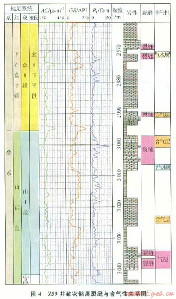低滲透砂巖油氣藏滲流起主導(dǎo)作用的為宏觀裂縫系統(tǒng),而微觀裂縫主要是改善儲(chǔ)層的滲透性能。裂縫是低滲透砂巖儲(chǔ)層的主要滲流通道,控制了油氣藏的滲流系統(tǒng)[6]。研究區(qū)占主導(dǎo)地位的是構(gòu)造裂縫,裂縫是極好的運(yùn)移通道,是溝通孔洞、形成優(yōu)質(zhì)儲(chǔ)層的重要因素,對(duì)天然氣聚集成藏的重要影響。在裂縫較為發(fā)育的地區(qū)或?qū)佣?,尤其是?duì)低孔、低滲的砂巖儲(chǔ)層而言,裂縫發(fā)育的層段,砂巖含氣性明顯好于一般的砂巖儲(chǔ)層,氣層、含氣層基本對(duì)應(yīng)于裂縫發(fā)育井段(圖4)。表明裂縫對(duì)儲(chǔ)層物性具有明顯的改善作用,是形成高產(chǎn)氣藏的重要條件。