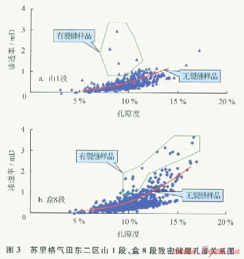 裂縫所形成的孔隙度占巖石體積的1%~2%,雖然構(gòu)成的儲(chǔ)集空間很小,對(duì)孔隙度的影響不大,但由于裂縫的存在,連通了孤立狀存在的孔隙,形成了砂巖的滲濾通道,提高了巖石的滲透率,對(duì)儲(chǔ)層的物性有明顯的改善作用。一般無裂縫發(fā)育的樣品,其孔隙度與滲透率呈現(xiàn)較好的線性正相關(guān)關(guān)系;而裂縫發(fā)育的樣品,其孔隙度并不一定很高,但滲透率明顯高于無裂縫樣品,滲透率值的分布脫離正??诐B線性關(guān)系(圖3)。裂縫的規(guī)模越大,其滲透率增加的幅度越大。在低滲透儲(chǔ)層中,裂縫是油氣運(yùn)移和流體滲流的主要通道,可以提高儲(chǔ)層的滲透性,裂縫的存在可使儲(chǔ)層滲透率比基質(zhì)滲透率增高1~2個(gè)數(shù)量級(jí),并使其水平滲透率各向異性在50∶1以上[5]。