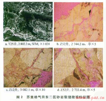 鑄體薄片、掃描電鏡中常見成巖裂縫,以溶蝕縫最常見(圖2),收縮縫和貼??p最少。研究區(qū)約30%的砂巖粒間孔具有溶蝕現(xiàn)象,在鏡下所見微孔隙直徑主要范圍在介于5~50μm,延伸范圍常超出視域,溶蝕裂縫形態(tài)多呈不規(guī)則彎曲狀,微裂縫可見分岔,溶蝕裂縫常溝通孔隙,改善儲(chǔ)層孔隙結(jié)構(gòu)。