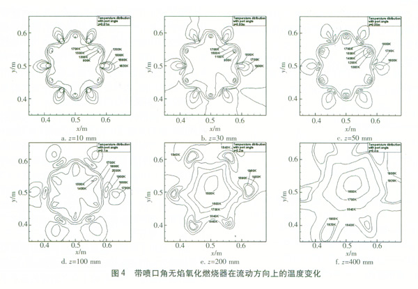 圖4給出了帶噴口角無焰氧化燃燒器溫度沿燃燒器軸線方向的變化情況。從圖4a可看出,燃燒器區(qū)域的最高溫度1 700 K位于空氣射流的某個(gè)半徑處,這表示空氣射流卷吸其附近的天然氣和燃燒產(chǎn)物使氧化劑、燃料和產(chǎn)物的比例在該空氣射流半徑處達(dá)到最佳的狀態(tài)。燃燒首先在那里發(fā)生,朝空氣射流中心的周圍擴(kuò)散。當(dāng)流動(dòng)進(jìn)一步向下游推進(jìn)時(shí),燃燒強(qiáng)度進(jìn)一步增加,溫度逐漸上升,最高溫度大約出現(xiàn)在z=100 mm處。在z=100mm之后,由于燃料大部分被燃燒,溫度又開始逐漸降低,并且由于混合更充分,溫度也變得更均勻。另外,由于噴嘴沿軸心具有向外的傾角,沿著軸線方向射流問的間隔也變得越大(即從射流整體運(yùn)動(dòng)來看,它像一個(gè)圓錐擴(kuò)展運(yùn)動(dòng),因此沿著石方向,即圓錐軸線方向,在圓錐橫截面上的各分射流間隔越來越大),在空氣射流和燃料射流混合之前,它們更充分地被燃燒產(chǎn)物所稀釋,燃燒區(qū)域更大,因此最高溫度也較低。
