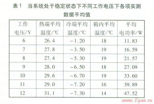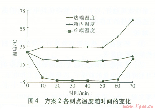 方案l:保持工作電壓為l2 V,散熱風扇運行,在正常環(huán)境溫度下,測量各測點溫度,直至冷端溫度、箱內(nèi)溫度穩(wěn)定為止。然后降低環(huán)境溫度,并記錄各測點溫度。