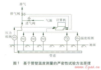 如上所述,采用現(xiàn)有的嚴(yán)密性試驗(yàn)方法無(wú)法準(zhǔn)確判斷燃?xì)夤艿赖膰?yán)密性情況,因此本文提出一種基于管壁溫度測(cè)量的嚴(yán)密性試驗(yàn)方法。該方法原理見圖l,具有下列特點(diǎn):