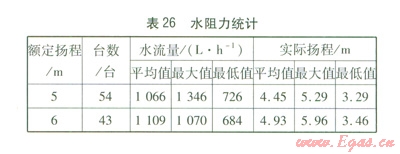 水阻力檢測(cè)時(shí)需要測(cè)量水泵的最大揚(yáng)程和最大流量,通過(guò)數(shù)據(jù)統(tǒng)計(jì)我們發(fā)現(xiàn)同一品牌同一型號(hào)的水泵,水流量和揚(yáng)程的區(qū)別很大。水阻力統(tǒng)計(jì)見(jiàn)表26。