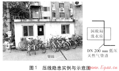 管道占壓隱患指城市燃?xì)廨斉湎到y(tǒng)中,不滿足《城鎮(zhèn)燃?xì)庠O(shè)計(jì)規(guī)范》GB 50028—2006及《燃?xì)廨斉涔こ淘O(shè)計(jì)施工驗(yàn)收技術(shù)規(guī)定》DB11/T 302—2005中關(guān)于地下燃?xì)夤艿琅c建筑物、構(gòu)筑物或相鄰管道之間的水平凈距、垂直凈距要求的管段[1、2]。