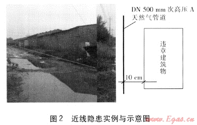 根據(jù)占壓形式的不同,管道占壓隱患又可以分為壓線隱患和近線隱患2類。壓線隱患是指建、構(gòu)筑物直接占壓在管道上方,占壓物邊界的投影在管道上方的隱患。近線隱患是指建、構(gòu)筑物邊界的投影在管道一側(cè),但管道與占壓物的水平凈距或垂直凈距不能滿足規(guī)范中的相關(guān)要求的隱患。壓線隱患、近線隱患實(shí)例見圖1、2。目前統(tǒng)計(jì)的695處管道占壓隱患中,壓線隱患有623處,占全部隱患的89.64%,近線隱患72處,占全部隱患的10.36%。