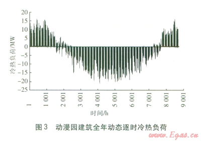 采用Energyplus模擬計算動漫園建筑全年動態(tài)逐時冷熱電負荷。全年動態(tài)逐時冷熱負荷見圖3,圖中正值為熱負荷,負值為冷負荷。由圖3可知,全年最大冷負荷為20 532.8 kW,最大熱負荷為15 987.3kW。建筑全年各時段用電負荷(不含空調系統(tǒng)用電負荷)比較均衡,全年最大用電負荷為6 883.5 kW。