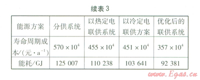 以熱定電聯供方案按照吸收式機組供熱量與熱負荷之比確定。經模型優(yōu)化后,當聯供系統(tǒng)壽命周期成本最小時,吸收式機組供熱量與熱負荷之比為0.4,即以熱定電聯供方案中吸收式機組的供熱量確定為熱負荷的40%,再根據吸收式機組的制熱性能系數確定所需熱量,從而確定以熱定電聯供系統(tǒng)的配置方案。以冷定電聯供方案的確定與以熱定電聯供系統(tǒng)方法基本一致,區(qū)別在于,經模型優(yōu)化后,當聯供系統(tǒng)壽命周期成本最小時,吸收式機組的供冷量與冷負荷之比為0.3。由表3可知,優(yōu)化后的聯供系統(tǒng)壽命周期成本及能耗最低,這表明優(yōu)化后的聯供系統(tǒng)在經濟性及節(jié)能方面均具有一定優(yōu)勢。