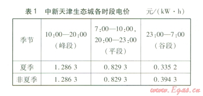 燃氣價格按照2.4 元/m3計算,中新天津生態(tài)城各時段電價見表l。此外,燃氣輪機部分負荷率下降到0.5以下時熱效率下降嚴重,因此將燃氣輪機部分負荷率≥0.5作為約束條件。將以上參數輸入到優(yōu)化評價模型就可得到聯供系統(tǒng)的最優(yōu)設備配置和運行策略。