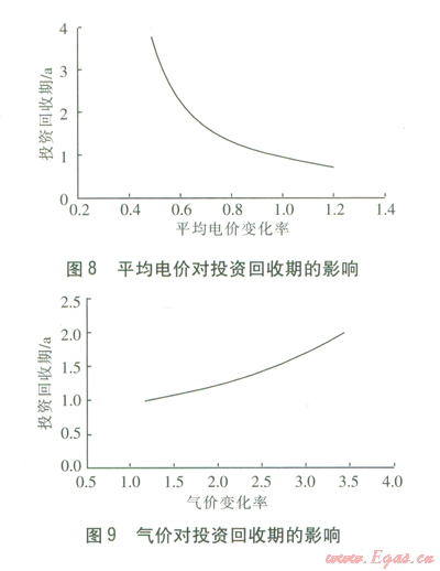 由圖8、9可知,當(dāng)平均電價降低時,投資回收期增加幅度較大,而平均電價的提高對投資回收期的影響不顯著。對于氣價的影響,投資回收期隨著氣價的提高逐漸上升。
