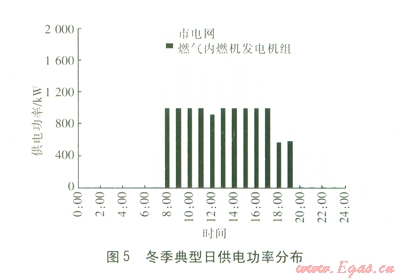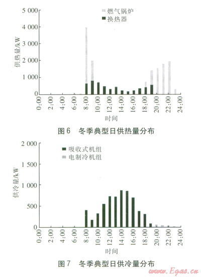 由圖5可知,燃氣內(nèi)燃機發(fā)電機組基本不承擔(dān)谷段電負荷。由圖6、7可知,考慮到吸收式機組不能在制冷、制熱兩種工況之間頻繁切換,而且吸收式機組的制冷性能系數(shù)較高,因此吸收式機組優(yōu)先用于供冷,采用換熱器、燃氣鍋爐用于供熱。