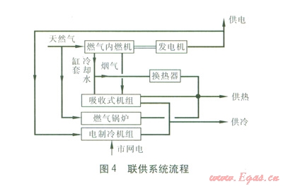 由于該辦公樓規(guī)模較小,岡此聯(lián)供系統(tǒng)采用燃氣內(nèi)燃機發(fā)電機組(包括燃氣內(nèi)燃機、發(fā)電機)+余熱型吸收式冷熱水機組(以下簡稱吸收式機組),聯(lián)供系統(tǒng)流程見圖4。燃氣內(nèi)燃機燃燒天然氣發(fā)電,吸收式機組利用燃氣內(nèi)燃機排放煙氣、缸套冷卻水制冷、制熱,缸套冷卻水也可以通過換熱器直接供熱,不足冷、熱量由電制冷機組、燃氣鍋爐補充。電制冷機組優(yōu)先使用聯(lián)供系統(tǒng)所發(fā)電力,不足電量由市電網(wǎng)補充。