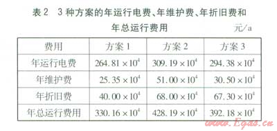 根據(jù)式(1)~(4)得出3種方案的年運(yùn)行電費(fèi)、年維護(hù)費(fèi)、年折舊費(fèi)和年總運(yùn)行費(fèi)用,見(jiàn)表2。