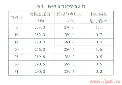 通過(guò)實(shí)際的數(shù)據(jù)收集,對(duì)某城市燃?xì)夤芫W(wǎng)系統(tǒng)進(jìn)行模擬,將得到的壓力與管網(wǎng)信息管理系統(tǒng)進(jìn)行對(duì)比,見(jiàn)表1。