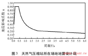 根據(jù)規(guī)范要求,采用如圖1形式的設(shè)計(jì)反應(yīng)譜。反應(yīng)譜相關(guān)參數(shù)設(shè)置如下:水平地震影響系數(shù)最大值為0.9,特征周期值為0.4s,建筑結(jié)構(gòu)的阻尼比取0.05,地震影響系數(shù)曲線的阻尼調(diào)整系數(shù)為1.0,曲線下降段自特征周期至5倍特征周期區(qū)段的衰減指數(shù)取0.9。直線下降段自5倍特征周期至6s區(qū)段下降斜率調(diào)整系數(shù)取0.02。通過計(jì)算,得到天然氣壓縮站所在場(chǎng)地地震設(shè)計(jì)譜如圖3所示。以該反應(yīng)譜作為該天然氣壓縮站所在場(chǎng)地的地震潛在危險(xiǎn)。
