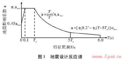 地震危險(xiǎn)性一般通過地震反應(yīng)譜加以描述。地震反應(yīng)譜代表了單自由度彈性系統(tǒng)在不同地震固有周期下的反應(yīng)最大值(包括峰值地面加速度、峰值地面速度等)。其橫坐標(biāo)對(duì)應(yīng)不同地震周期,縱坐標(biāo)為各結(jié)構(gòu)自振周期對(duì)應(yīng)體系的反應(yīng)最大值。在我國(guó)《建筑抗震設(shè)計(jì)規(guī)范》中以地震影響系數(shù)作為抗震設(shè)計(jì)的依據(jù),給出的地震設(shè)計(jì)反應(yīng)譜(地震影響系數(shù)曲線)[12](圖1)。圖1中α為地震影響系數(shù),α=Sa/g(無量綱);Sa為單質(zhì)點(diǎn)體系在地震作用下的最大反應(yīng)加速度(g);g為重力加速度(m/s2);αmax為地震影響系數(shù)最大值(無量綱);η1為直線下降段的斜率調(diào)整系數(shù)(無量綱);γ為衰減指數(shù)(無量綱);Tg為特征周期(s);η2為阻尼調(diào)整系數(shù)(無量綱);T為結(jié)構(gòu)自振周期(s)。